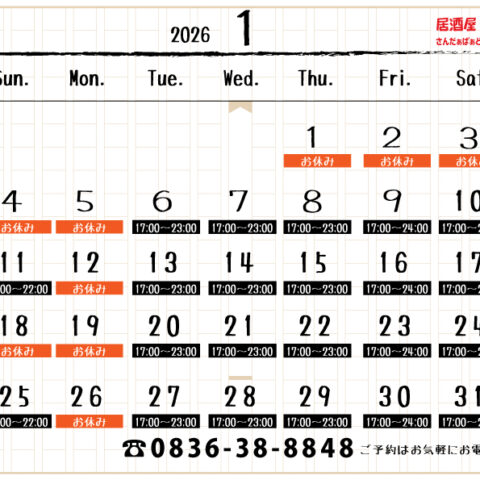 12月の営業のお知らせです!お休みは1、7、8、15、22、24、31です。新年は6日から営業です。 忘年会新年会ともにご予約承っております!ただ、金曜日はすでにご予約が多いのでお早めにご連絡ください。 月曜日は定休日火 […]