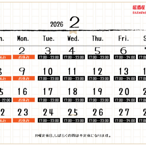 12月の営業のお知らせです!お休みは1、7、8、15、22、24、31です。新年は6日から営業です。 忘年会新年会ともにご予約承っております!ただ、金曜日はすでにご予約が多いのでお早めにご連絡ください。 月曜日は定休日火 […]