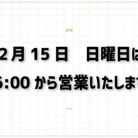 明けましておめでとうございます。昨年は大変お世話になりました。 本年も変わらずご贔屓いただけますと幸せます。 1月の営業のお知らせです。年始の営業再開は6日(火曜日)から営業致します。 お休みは1、2、3、4、5、12、 […]
