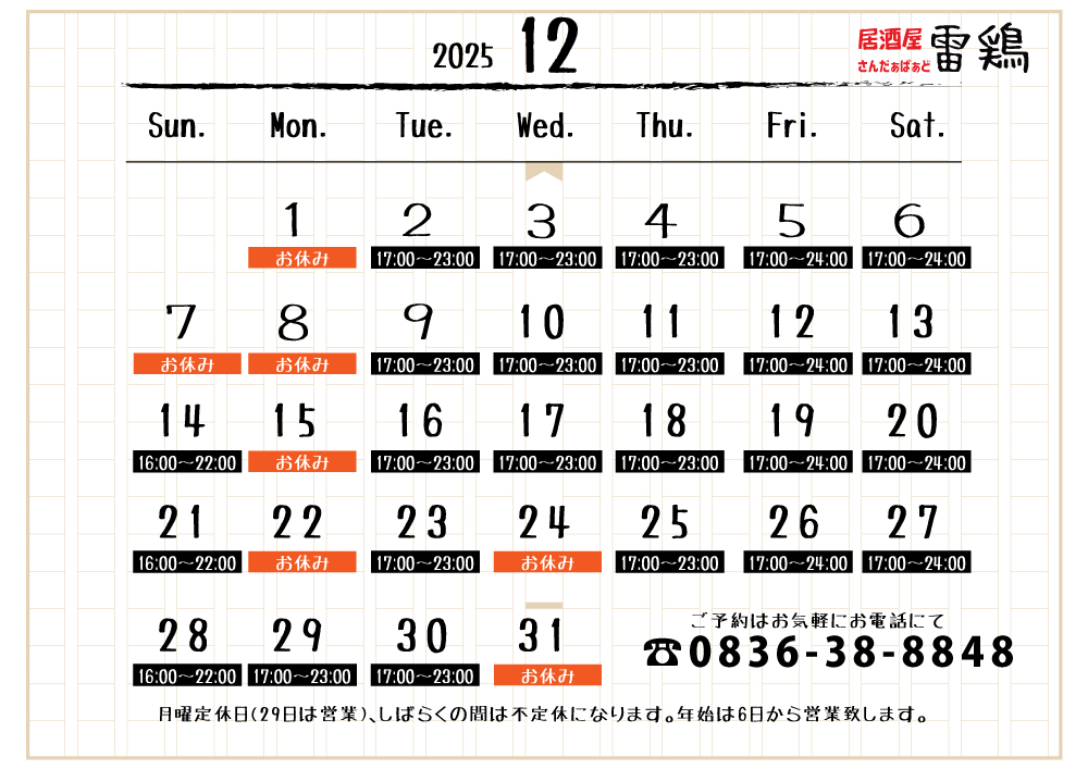 12月の営業のお知らせです!お休みは1、7、8、15、22、24、31です。新年は6日から営業です。